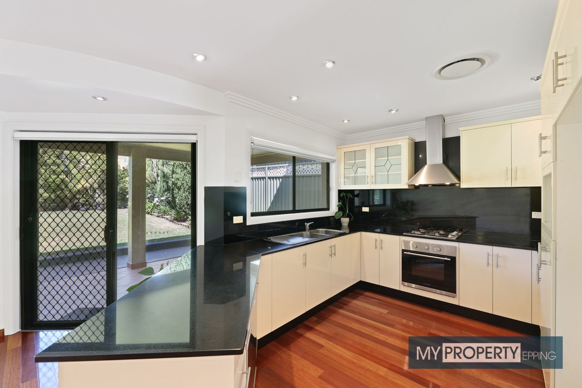 Large Chef's kitchen with quality gas cooking, granite benchtops and breakfast bar overlooking backyard